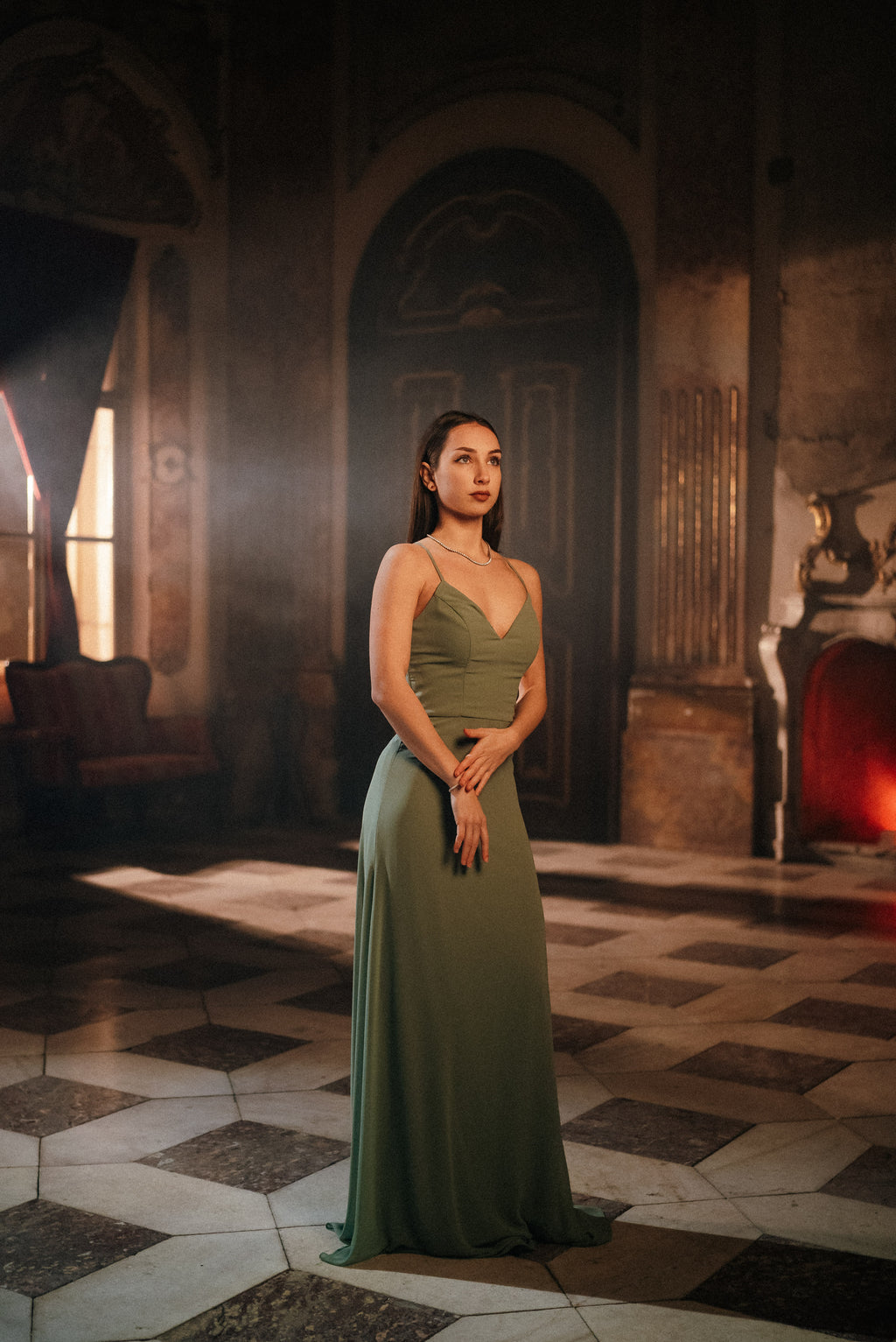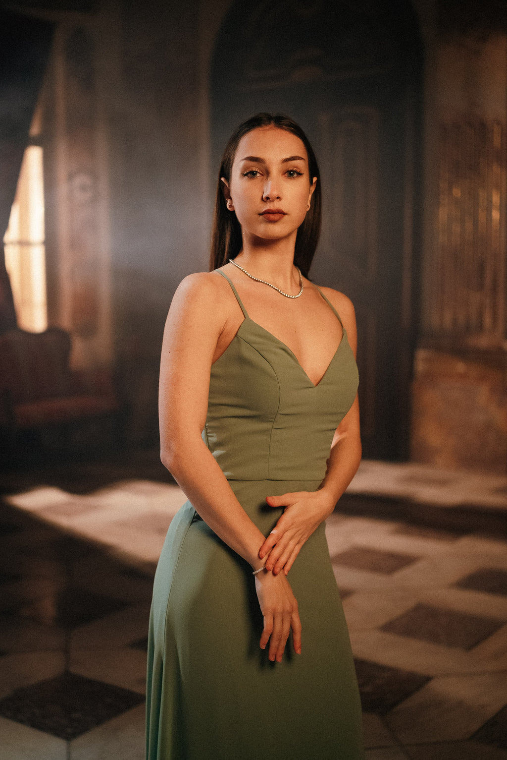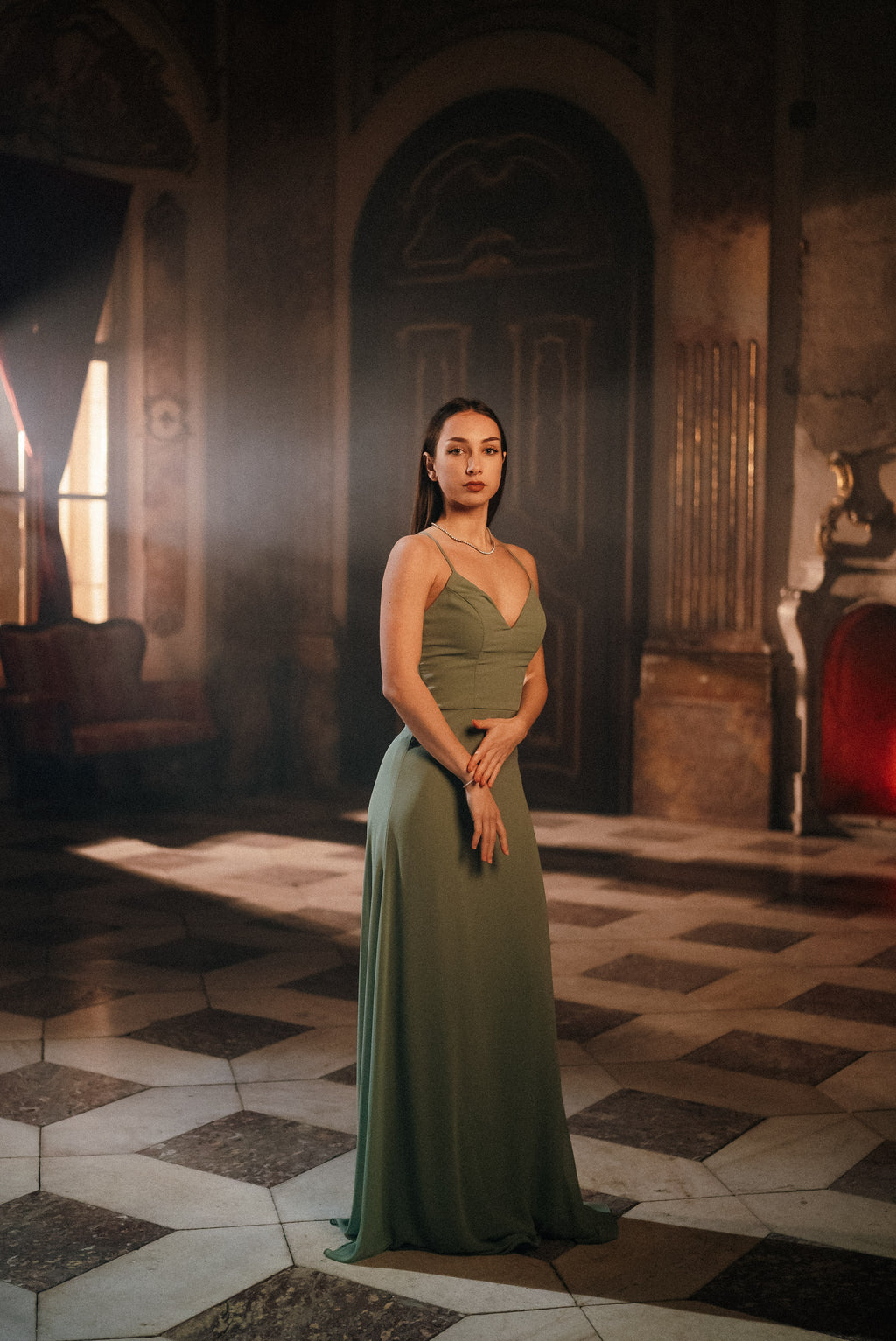 Očarajte s preprostostjo in sofisticiranostjo! Dolga večerna obleka v nežni olivno zeleni barvi združuje klasičen kroj z brezčasno ženstvenostjo. Zgornji del krasijo prefinjene naramnice in rahlo srčkast izrez, ki lepo poudari dekolte. Padajoče krilo iz lahkotnega materiala poskrbi za eleganten videz in udobje skozi ves večer.